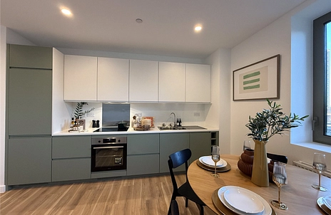 Apartment 28 comes with a stylish modern open plan living space with natural oak wooden effect flooring, a sleek kitchen with fully integrated appliances, including Zanussi stainless steel single oven, fridge freezer, ceramic hob, dishwasher, and a washer dryer. Floor to ceiling sliding doors leads to your private balcony. Additionally, there are two spacious bedrooms with fitted carpets, the apartment includes a generous sized family bathroom with a pop of colour.