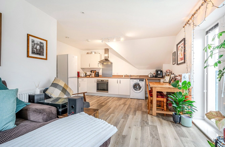 At the heart of the apartment is a generous open-plan kitchen and living area, perfect for everyday living and entertaining. The kitchen is neatly integrated into the space, allowing for easy social interaction while cooking, with ample room for both dining and relaxing. The property features two well-proportioned bedrooms, each offering a calm and private retreat. Both rooms are versatile, making them suitable for use as a main bedroom, guest room, or home office, depending on your needs. A well-appointed bathroom completes the accommodation, finished in a clean and functional style. The layout of the apartment ensures a good separation between living and sleeping areas, enhancing comfort and privacy. Further benefits include two allocated parking spaces and a long lease.