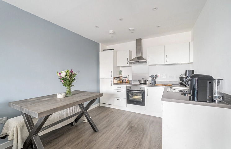 The apartment boasts a bright and spacious open-plan living room and kitchen, perfect for modern living and entertaining. The kitchen is well-fitted with sleek units and integrated appliances.
